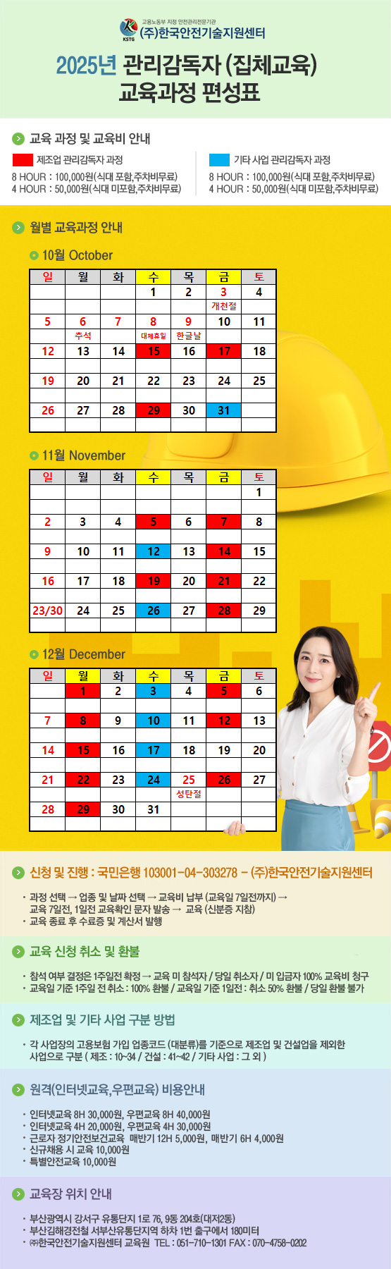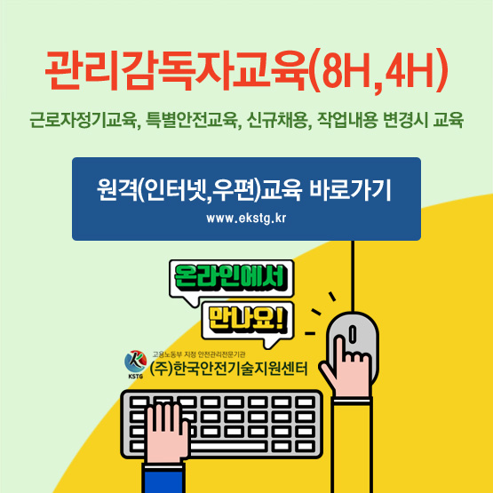 - 주요알림 연간일정표 신청절차 교육공지 관리감독자교육 위험성평가 담당자교육 교육접수 접수확인 및 취소 이수이력확인 및 출력 온라인교육 접수 바로가기 수강신청서 다운로드 업종코드 확인 바로가기 전년도 무재해 사업장 확인 바로가기